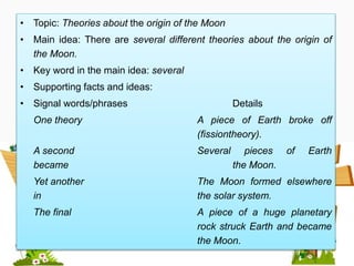 Patterns of Organization -Tutor Hints A typical reading selection contains a list of details that supports a main idea. There are seven different patterns that are commonly used to organize documents. 1A topic is divided into groups or parts.